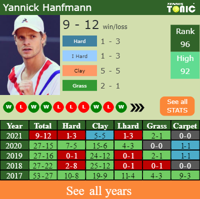 Hanfmann has a composed 9-12 win-loss record in 2021, 2-1 on grass (See FULL STATS).