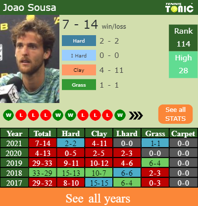 Sousa has a winning record in the last 10 years having won 51% of his matches (295-283). 1-1 on grass in 2021. Regarding his performance on the same surface of this event, Sousa has a composed 22-23 record in the last years on grass.