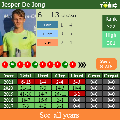 Jesper has an aggregate 6-13 win-loss record in 2021, 2-4 on clay (See FULL STATS).