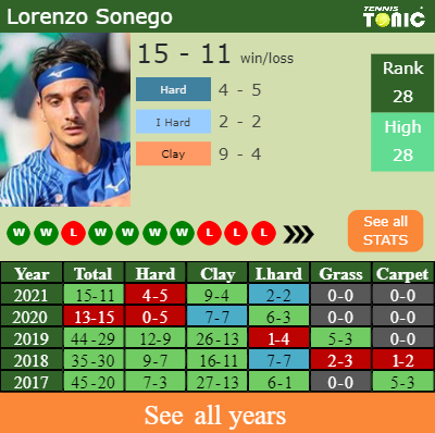 The Italian has an aggregate 15-11 win-loss record in 2021, 0-0 on grass (See FULL STATS).