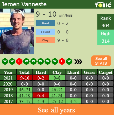 Vanneste has a solid match record in the last 6 years having won 60% of his matches (183-123). 9-8 on clay in 2021. Talking about his performance on the same surface of this event, Vanneste has a composed162-97 match record in the last 6 years on clay.