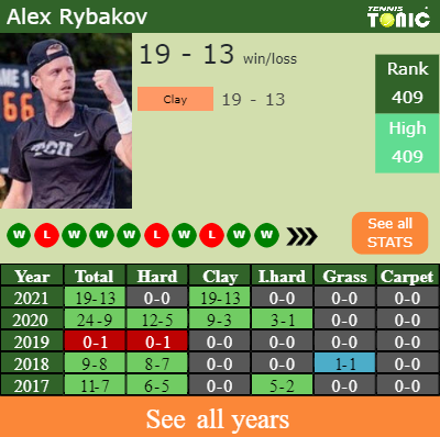The American has a composed 19-13 win-loss record in 2021, 19-13 on clay (See FULL STATS).