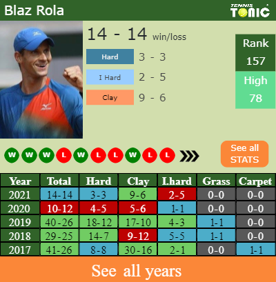 The Slovenian has a compiled 14-14 win-loss record in 2021, 9-6 on clay (See FULL STATS).