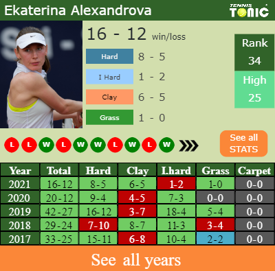 Alexandrova has an aggregate 16-12 win-loss record in 2021, 1-0 on grass (See FULL STATS).