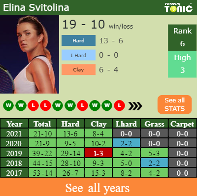 Elina has a compiled 21-10 win-loss record in 2021, 0-0 on grass (See FULL STATS).