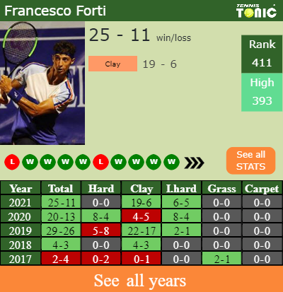 Forti has an overall 25-11 win-loss record in 2021, 19-6 on clay (See FULL STATS).