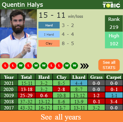 Halys has a favorable record in the last 10 years having won 54% of his matches (257-217). 8-5 on clay in 2021. Regarding his performance on the same surface of this tournament, Halys has a compiled 75-71 match record in the last years on clay.