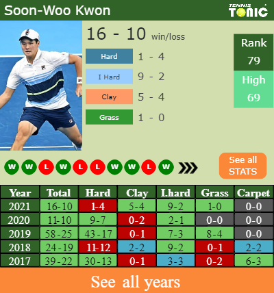 Kwon has a solid record in the last 8 years having won 63% of his matches (218-128). 1-0 on grass in 2021. Talking about his performance on the same surface of this competition, Kwon has a composed9-7 record in the last 8 years on grass.