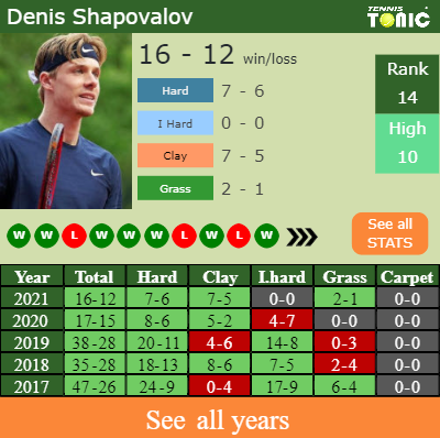 Shapovalov has an aggregate 16-12 win-loss record in 2021, 2-1 on grass (See FULL STATS).