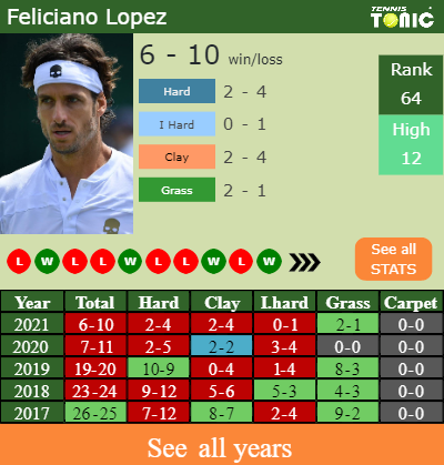 Lopez has a compiled 6-10 win-loss record in 2021, 2-1 on grass (See FULL STATS).