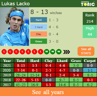 The Slovakian has an aggregate 8-13 win-loss record in 2021, 3-0 on grass (See FULL STATS).