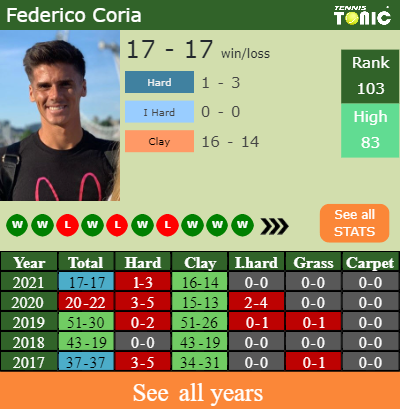 Coria has an overall 17-17 win-loss record in 2021, 16-14 on clay (See FULL STATS).