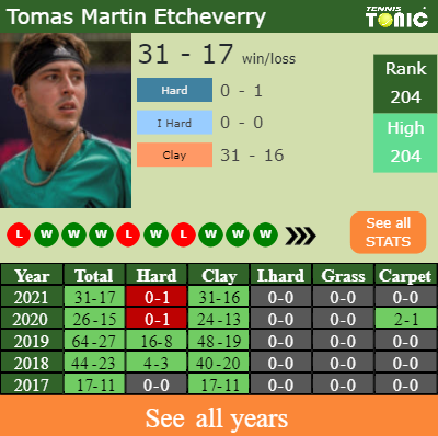 Martin Etcheverry has an aggregate 31-17 win-loss record in 2021, 31-16 on clay (See FULL STATS).