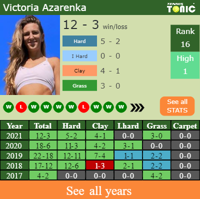Azarenka has a solid record in the last 10 years having won 75% of her matches (261-85). 3-0 on grass in 2021. Talking about her performance on the same surface of this event, Azarenka has an aggregate 28-11 record in the last years on grass.