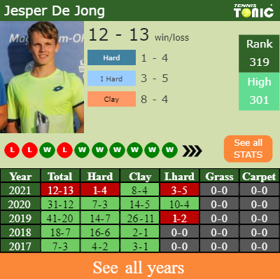 Jesper has a compiled 12-13 win-loss record in 2021, 8-4 on clay (See FULL STATS).