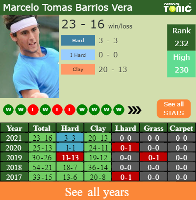 Tomas Barrios Vera has a solid match record in the last 7 years having won 65% of his matches (236-127). 20-13 on clay in 2021. Talking about his performance on the same surface of this event, Tomas Barrios Vera has an overall168-88 record in the last 7 years on clay.