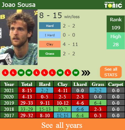 Sousa has an overall 8-15 win-loss record in 2021, 2-2 on grass (See FULL STATS).
