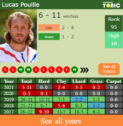 Lucas has an aggregate 5-11 win-loss record in 2021, 0-2 on grass (See FULL STATS).