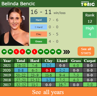 Bencic has a compiled 16-11 win-loss record in 2021, 4-0 on grass (See FULL STATS).