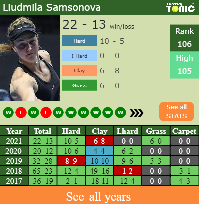 Samsonova has an aggregate 22-13 win-loss record in 2021, 6-0 on grass (See FULL STATS).