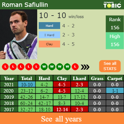 The Russian has an aggregate 10-10 win-loss record in 2021, 0-0 on grass (See FULL STATS).