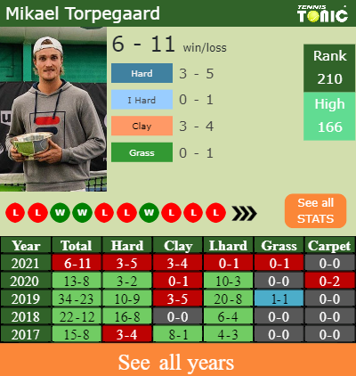 In terms of his career, Torpegaard has an overall 131-77 record. He has a negative 1-2 record on grass.