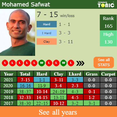 The Egyptian has an overall 7-15 win-loss record in 2021, 0-0 on grass (See FULL STATS).