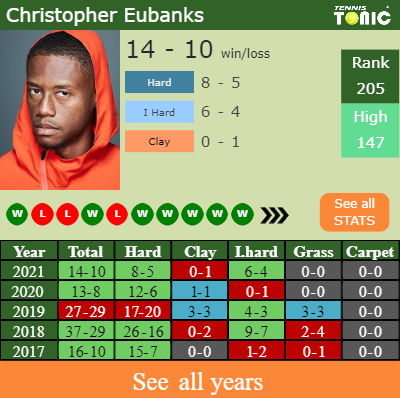 This will be the 2nd time that Christopher Eubanks and Viktor Troicki square off. The head to head is 1-0 for Eubanks (see full H2H stats), but they have never competed against each other on grass.