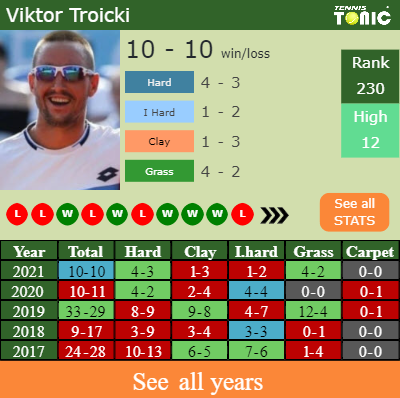 Viktor has a compiled 10-10 win-loss record in 2021, 4-2 on grass (See FULL STATS).