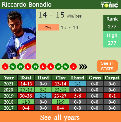 Riccardo has an aggregate 14-15 win-loss record in 2021, 13-14 on clay (See FULL STATS).
