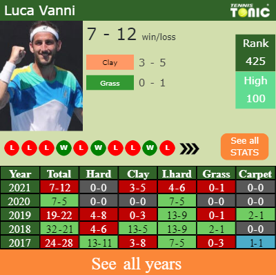 Vanni has a compiled 7-12 win-loss record in 2021, 3-5 on clay (See FULL STATS).