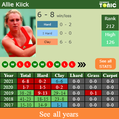 In terms of her career, Kiick has an overall 218-151 record. She has a negative 2-4 record on grass.