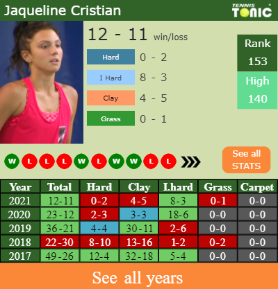 Jaqueline has a compiled 12-11 win-loss record in 2021, 0-1 on grass (See FULL STATS).