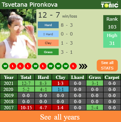 Tsvetana has a composed 12-7 win-loss record in 2021, 3-1 on grass (See FULL STATS).