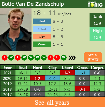 Van De Zandschulp has a solid win-loss record in the last 7 years having won 66% of his matches (213-108). 1-1 on grass in 2021. In connection with his performance on the same surface of this competition, Van De Zandschulp has an aggregate1-2 record in the last 7 years on grass.