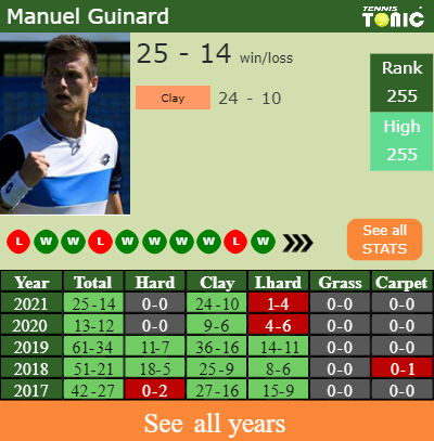 Guinard has a solid match record in the last 8 years having won 62% of his matches (235-145). 24-10 on clay in 2021. Regarding his performance on the same surface of this event, Guinard has an aggregate156-79 win-loss record in the last 8 years on clay.