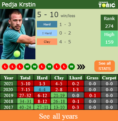 The Serbian has an overall 5-10 win-loss record in 2021, 4-5 on clay (See FULL STATS).