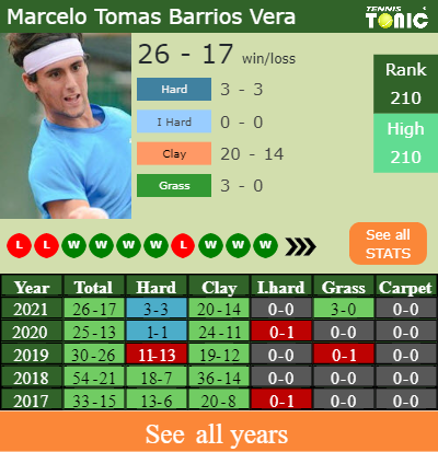 Marcelo has a compiled 26-17 win-loss record in 2021, 3-0 on grass (See FULL STATS).