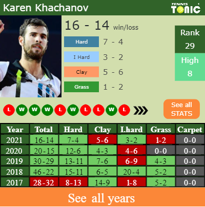 Khachanov has an aggregate 16-14 win-loss record in 2021, 1-2 on grass (See FULL STATS).