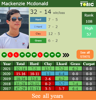 Mackenzie has an aggregate 32-14 win-loss record in 2021, 6-2 on grass (See FULL STATS).