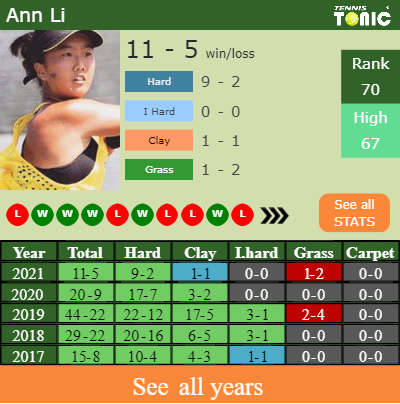 Li has a compiled 11-5 win-loss record in 2021, 1-2 on grass (See FULL STATS).