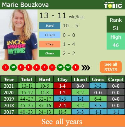 This will be the 2nd time that Marie Bouzkova and Vera Zvonareva clash against each other. The head to head is 1-0 for Bouzkova (see full H2H stats), but they have never competed against each other on grass.