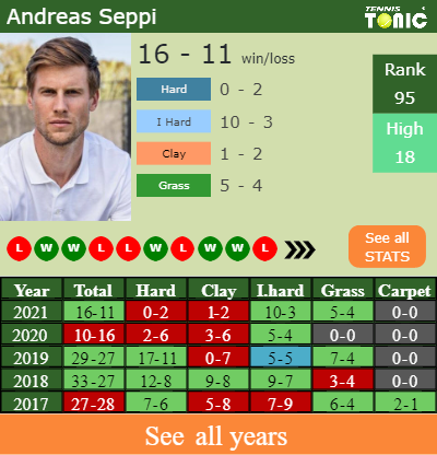 The Italian has an aggregate 16-11 win-loss record in 2021, 5-4 on grass (See FULL STATS).
