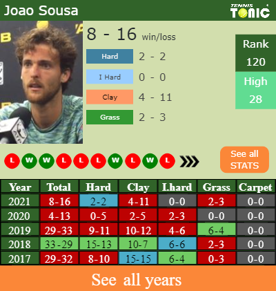 Joao has an overall 8-16 win-loss record in 2021, 2-3 on grass (See FULL STATS).