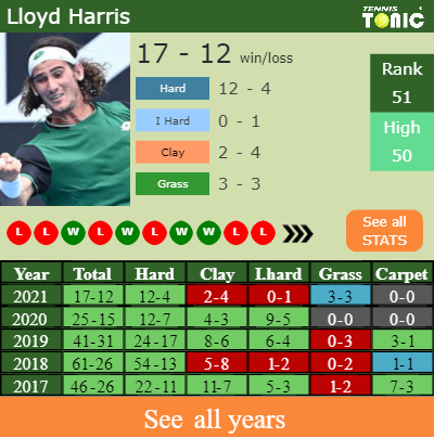 This will be the 2nd time that Lloyd Harris and Richard Berankis square off. The head to head is 1-0 for Lloyd (see full H2H stats), but they have never played each other on grass.