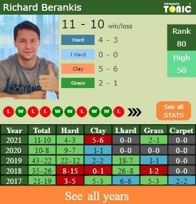 In terms of his career, Berankis has an overall 509-319 record. He has a positive 29-24 record on grass.