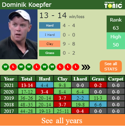 The German has a compiled 13-14 win-loss record in 2021, 0-2 on grass (See FULL STATS).