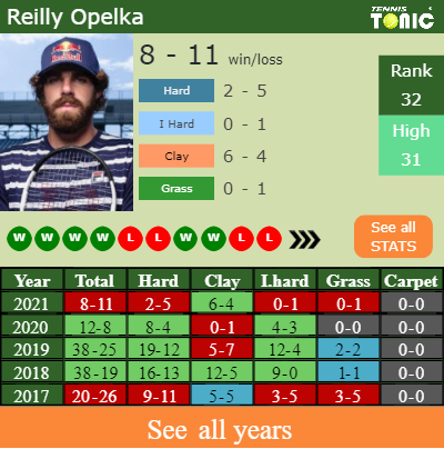 Reilly has an overall 8-11 win-loss record in 2021, 0-1 on grass (See FULL STATS).