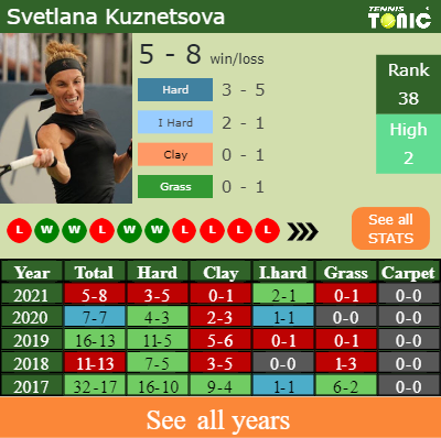 Svetlana has an aggregate 5-8 win-loss record in 2021, 0-1 on grass (See FULL STATS).