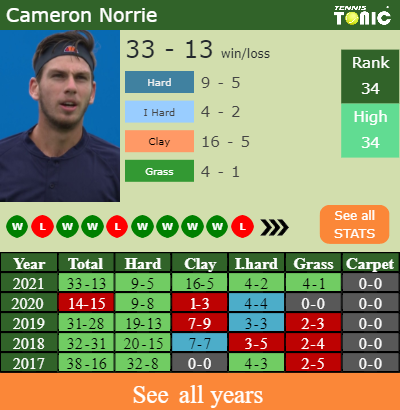 Talking about his overall career, Norrie has an overall 241-146 record. He has a negative 12-19 record on grass.